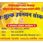 बिलासपुर- परशुराम ब्राह्मण समाज एवं परशुराम महिला ब्राह्मण कल्याण समिति, बिलासपुर द्वारा सामूहिक निःशुल्क उपनयन संस्कार के आयोजन को लेकर एक महत्वपूर्ण बैठक समाज के अध्यक्ष डॉ. गायत्री प्रसाद पांडे के निवास स्थान पर आयोजित की गई। बैठक में सर्वसम्मति से निर्णय लिया गया कि इस वर्ष भी 20 अप्रैल को खाटू श्याम मंदिर, बिलासपुर