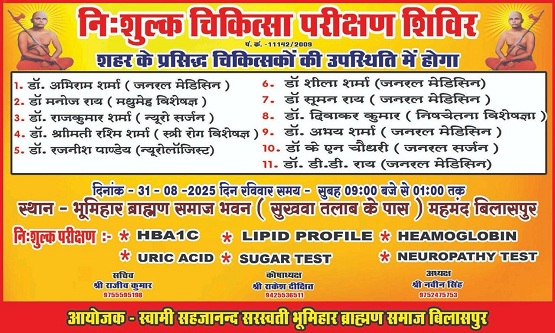 बिलासपुर . भुमिहार ब्राम्हण समाज बिलासपुर द्वारा समाज शहर एवं अपोलो के प्रसिद्ध चिकित्सकों की उपस्थिति में निःशुल्क चिकित्सा प्रशिक्षण शिविर आयोजित किया गया है। दिनांक 31.08.2025 दिन रविवार समय सुबह 09 बजे से दोपहर 01 बजे तक भुमिहार ब्राम्हण समाज भवन (सुकुवा तालाब के पास) में विशाल निःशुल्क चिकित्सा प्रशिक्षण शिविर शहर एवं अपोलो हास्पिटल के प्रसिद्ध चिकित्सकों की उपस्थिति में आयोजित है। शिविर में प्रमुख रूप से डॉ. अभिराम शर्मा, डॉ. अभय शर्मा, डॉ. मनोज राय डॉ. रजनिश पाण्डेय, डॉ. राजकुमार शर्मा, डॉ. के.एन चौधरी, डॉ. श्रीमती रश्मि शर्मा, डॉ. श्रीमती शीला शर्मा, डॉ. श्रीमती सुमन राय, डॉ. दीवाकर कुमार, डॉ. डी.डी. राय आदि उपस्थित रहेंगे।