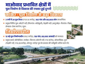 कांकेर में नरहरपुर विकासखण्ड के अंतिम छोर को जोड़ने के लिए बांसपत्तर-तिरियारपानी मार्ग में स्वीकृत पांच वृहद पुलों में से एक का कार्य पूर्ण हो चुका है। शेष चार पुलों के काम अगले वर्ष (2026) मार्च तक पूर्ण हो जाएंगे। जिले के इसी सीमावर्ती क्षेत्र में लेण्डारा से ठेमा मार्ग पर दो वृहद् पुल बने हैं। इनके निर्माण से कोण्डागांव जिले के विश्रामपुरी-बड़ेराजपुर विकासखण्ड से सीधा बारहमासी संपर्क हो गया है। विकास की दौड़ में अछूता सा रह गया यह क्षेत्र भी अब तेजी से विकास करेगा।