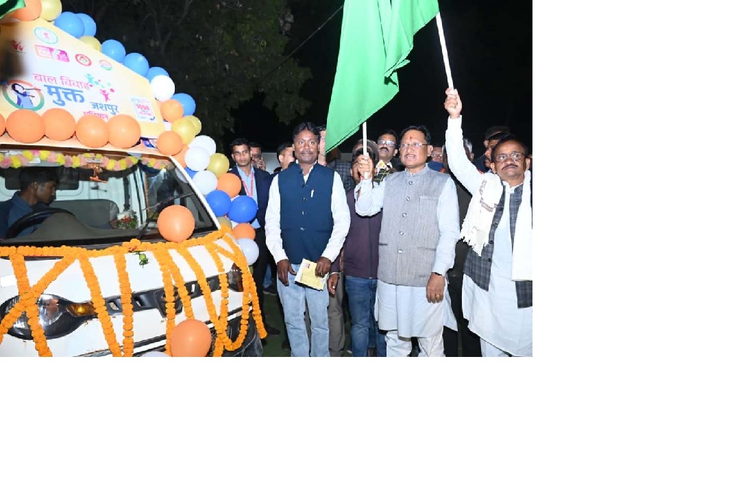 रायपुर. मुख्यमंत्री  विष्णुदेव साय ने आज फरसाबहार स्थित सामुदायिक स्वास्थ्य केंद्र परिसर से बाल विवाह मुक्त जशपुर अभियान रथ को हरी झंडी दिखाकर रवाना किया। यह जागरूकता रथ जिले के शहरी क्षेत्रों के साथ-साथ दूरस्थ ग्रामीण अंचलों में भ्रमण कर लोगों को बाल विवाह के दुष्परिणामों के प्रति जागरूक करेगा। इस अवसर पर मुख्यमंत्री ने कहा कि बाल विवाह बच्चों के भविष्य के साथ खिलवाड़ है और इसे रोकना समाज की सामूहिक जिम्मेदारी है। उन्होंने आमजन से अपील की कि यदि कहीं भी बाल विवाह की आशंका हो तो बिना झिझक 1098 पर सूचना दें और इस सामाजिक बुराई के रोकथाम में सहभागी बनें।
