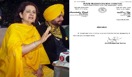 नवजोत कौर सिद्धू को उनके विवादास्पद बयान के बाद कांग्रेस पार्टी से तत्काल प्रभाव से निलंबित कर दिया गया है। यह सिद्धू के उस विवादित बयान के कुछ ही घंटों बाद हुआ है जिसमें उन्होंने कहा था कि जो 500 करोड़ रुपये का सूटकेस देता है, वह पंजाब का मुख्यमंत्री बन जाता है। उन्होंने कांग्रेस नेतृत्व पर भ्रष्टाचार के गंभीर आरोप भी लगाए। पंजाब कांग्रेस के पूर्व अध्यक्ष नवजोत सिंह सिद्धू की पत्नी कौर ने शनिवार को राज्यपाल गुलाब चंद कटारिया से मुलाकात के बाद पत्रकारों से कहा हम हमेशा पंजाब और पंजाबियत की बात करते हैं…लेकिन हमारे पास 500 करोड़ रुपये नहीं हैं जो हम मुख्यमंत्री की कुर्सी पर बैठने के लिए दे सकें।