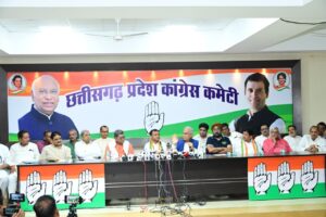 रायपुर। प्रदेश कांग्रेस मुख्यालय राजीव भवन में प्रदेश कांग्रेस अध्यक्ष दीपक बैज, नेता प्रतिपक्ष डॉ. चरणदास महंत, पूर्व मुख्यमंत्री भूपेश बघेल और कांग्रेस के वरिष्ठ नेताओं ने पत्रकार वार्ता लेकर आरोप लगाया कि
