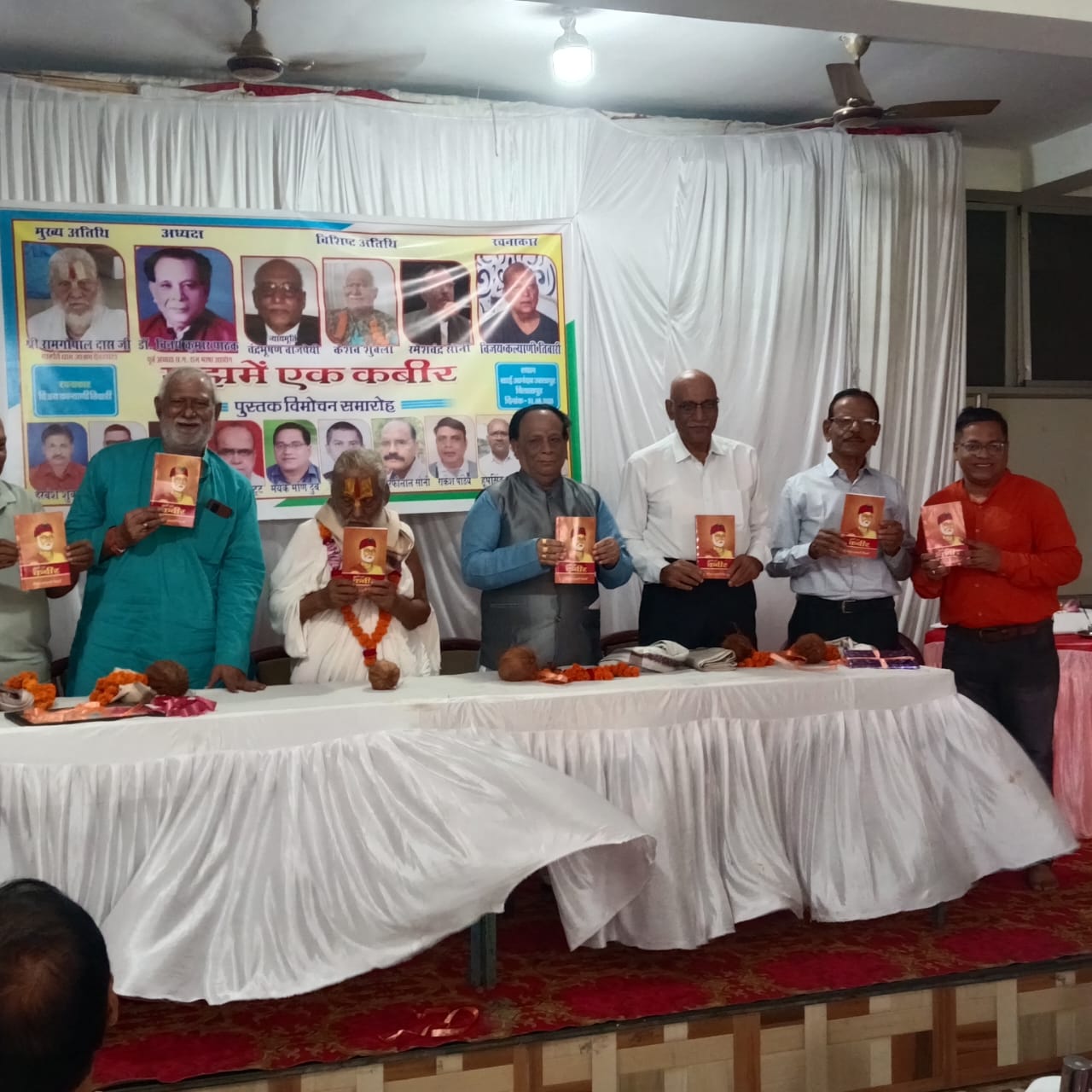 बिलासपुर. सांई आनंदम परिसर में विजय कल्याणी तिवारी कृत “मुझमें एक कबीर” 731 दोहे से अलंकृत कृति का विमोचन मारुति धाम देवरघटा (शिवरीनारायण)के पूज्य 107 वर्षीय संतश्री रामगोपाल महाराज जी मुख्य आतिथ्य, थावे विश्व विद्यालय बिहार के कुलपति, पूर्व छत्तीसगढ़ राजभाषा आयोग के अध्यक्ष भाषाविद् डॉ.विनय कुमार पाठक, विशिष्ट आतिथ्य न्यायमूर्ति चंद्रभूषण बाजपेयी, विशिष्ट अतिथि वरिष्ठ पत्रकार एवं उपन्यासकार केशव शुक्ल की उपस्थिति में विमोचन हुआ।संचालन वरिष्ठ कवि हरबंश शुक्ल तथा संपादकीय अतिथि डॉ.रमेश चन्द्र सोनी की उपस्थिति विशिष्ट रही है।