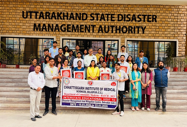 बिलासपुर। छत्तीसगढ़ आयुर्विज्ञान संस्थान (सिम्स) के कम्युनिटी मेडिसिन विभाग द्वारा विद्यार्थियों को प्राकृतिक आपदाओं से बचाव, राहत व पुनर्वास कार्यों की व्यवहारिक जानकारी देने के उद्देश्य से उत्तराखंड राज्य आपदा प्रबंधन प्राधिकरण, देहरादून स्थित डिजास्टर मैनेजमेंट एंड मिटिगेशन सेंटर में एक सप्ताह का शैक्षणिक भ्रमण आयोजित किया गया। 15 मार्च से 22 मार्च तक इस भ्रमण में पीजी व इंटर्न छात्र-छात्राओं ने सक्रिय सहभागिता करते हुए आपदा प्रबंधन की बारीकियां सीखी।